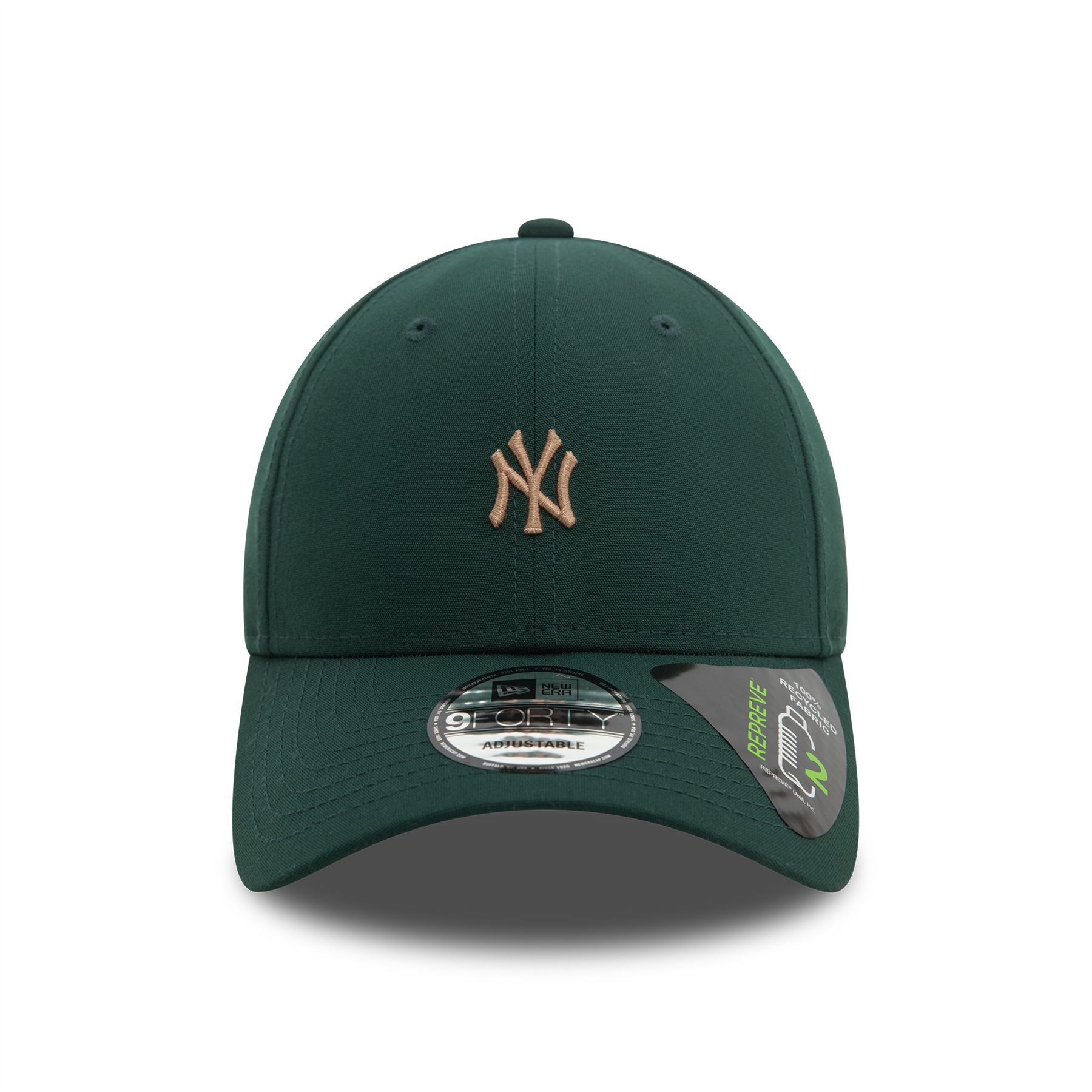 Repreve® Mini Logo New York Yankees 9FORTY Cap. New York Yankees mini logo on front. Made with Repreve® fabric. Embroidered New Era flag on left. 6 panel structured crown. Curved visor with rear strapback fastener. Green Cap with black undervisor.