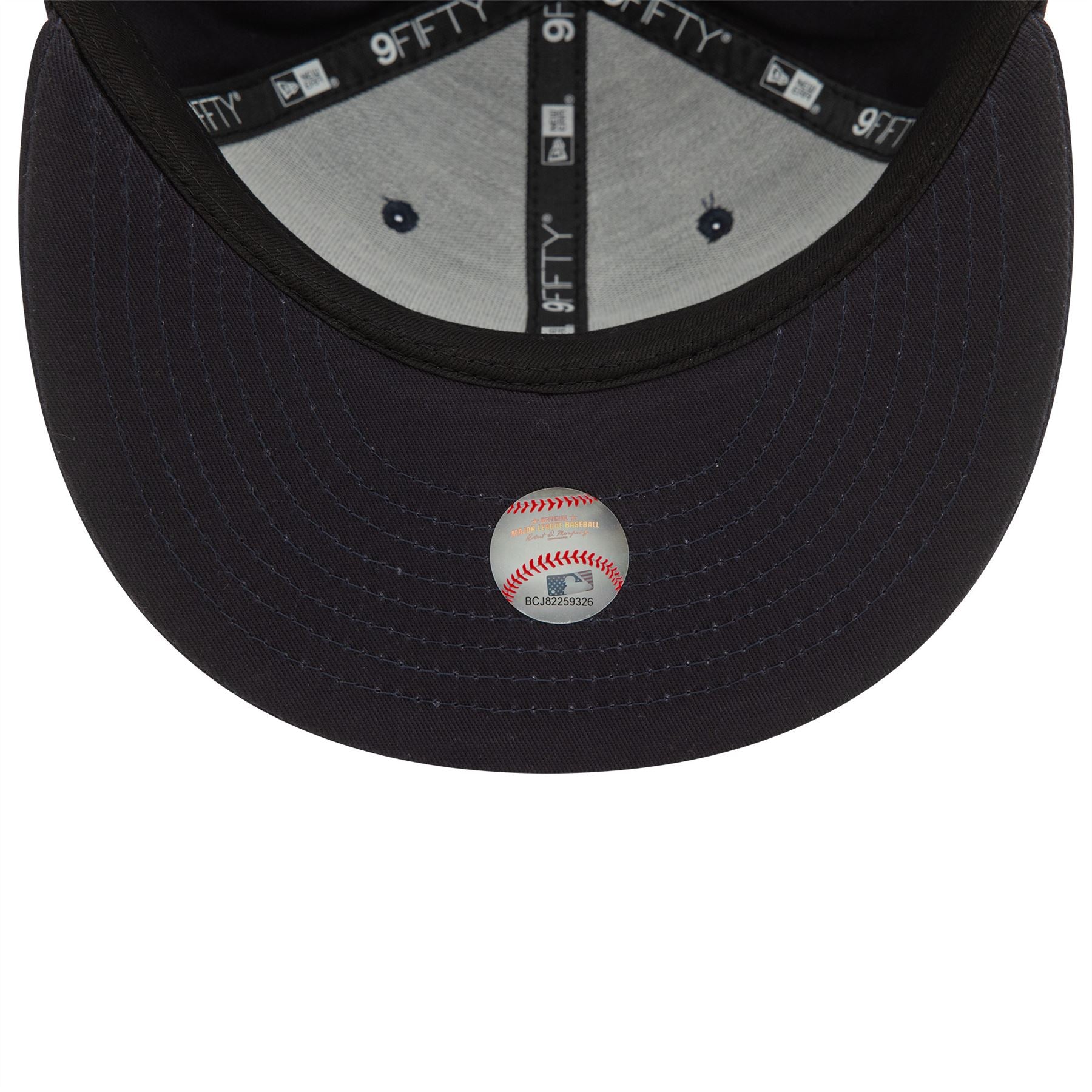 New York Yankees Wordmark Patch Navy 9FIFTY Snapback Cap. Embroidered Yankees wordmark logo on front. New York Yankees sidepatch on right. Embroidered New Era flag on left. 6 panel structured crown. Flat visor with rear snapback fastener. Navy blue Cap with navy blue undervisor.