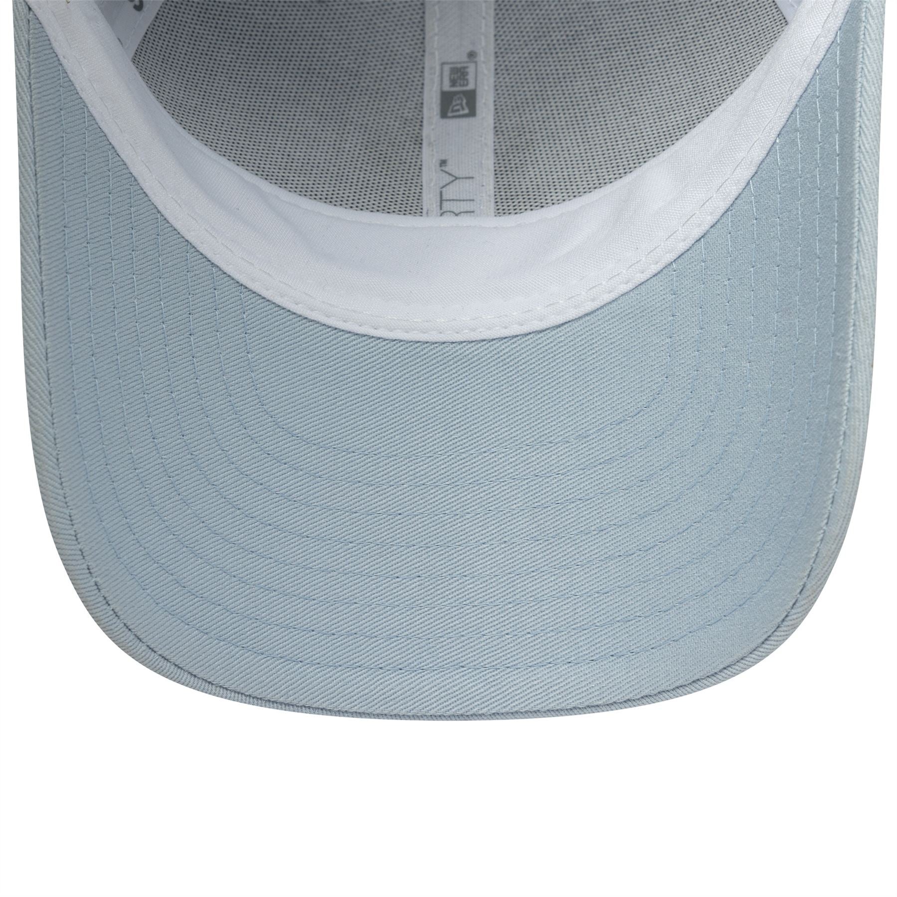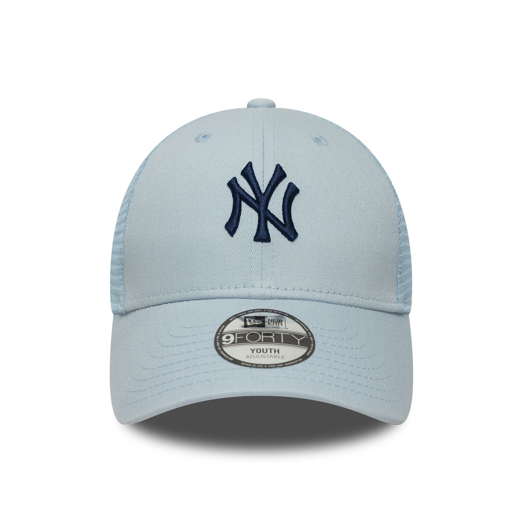 Embroidered New York Yankees logo on front. Embroidered New York Yankees woven label on rear. Embroidered New Era flag on left. 6 panel structured crown. Curved visor with rear adjustable fastener. Mesh sides and back panels. Pastel blue Cap with pastel blue undervisor.