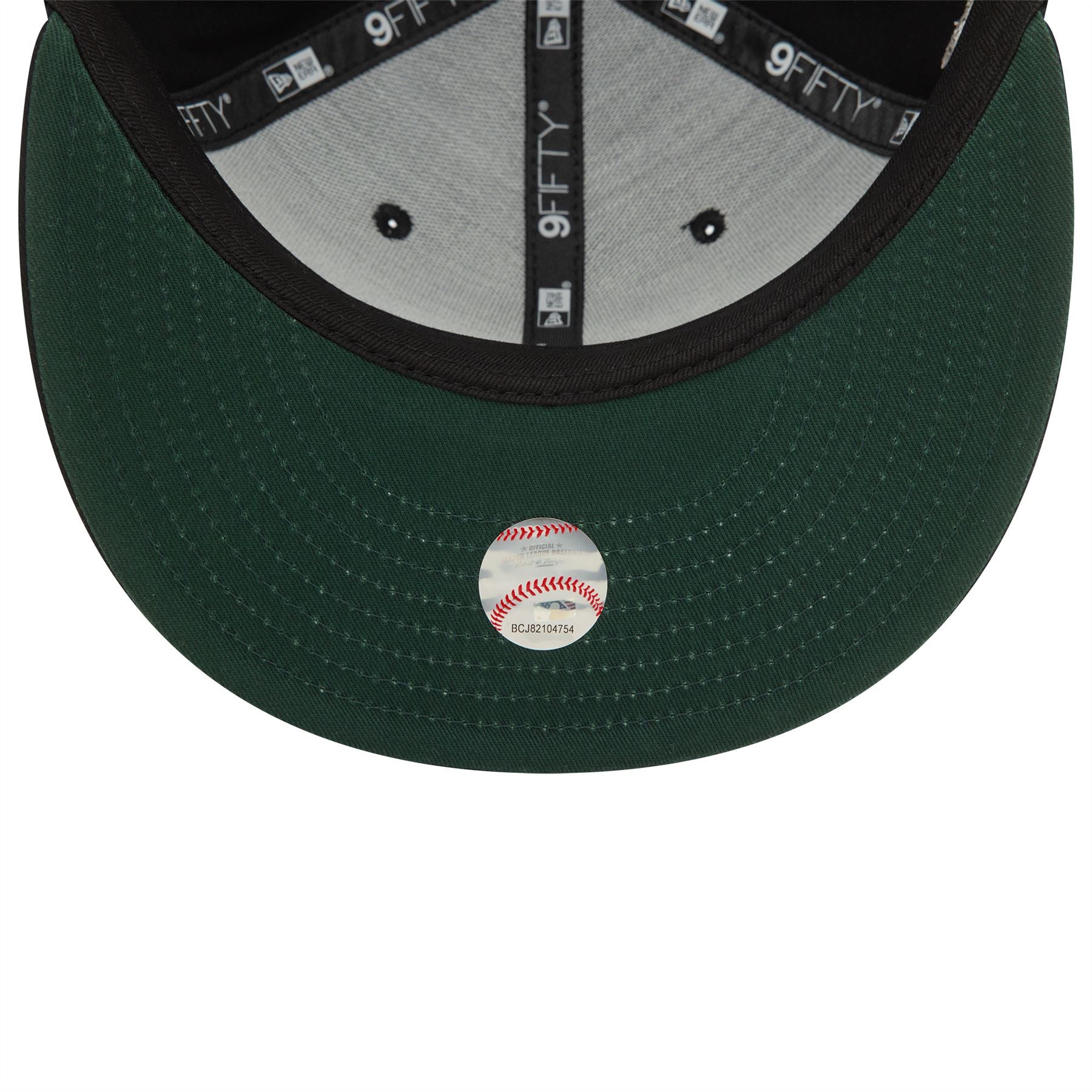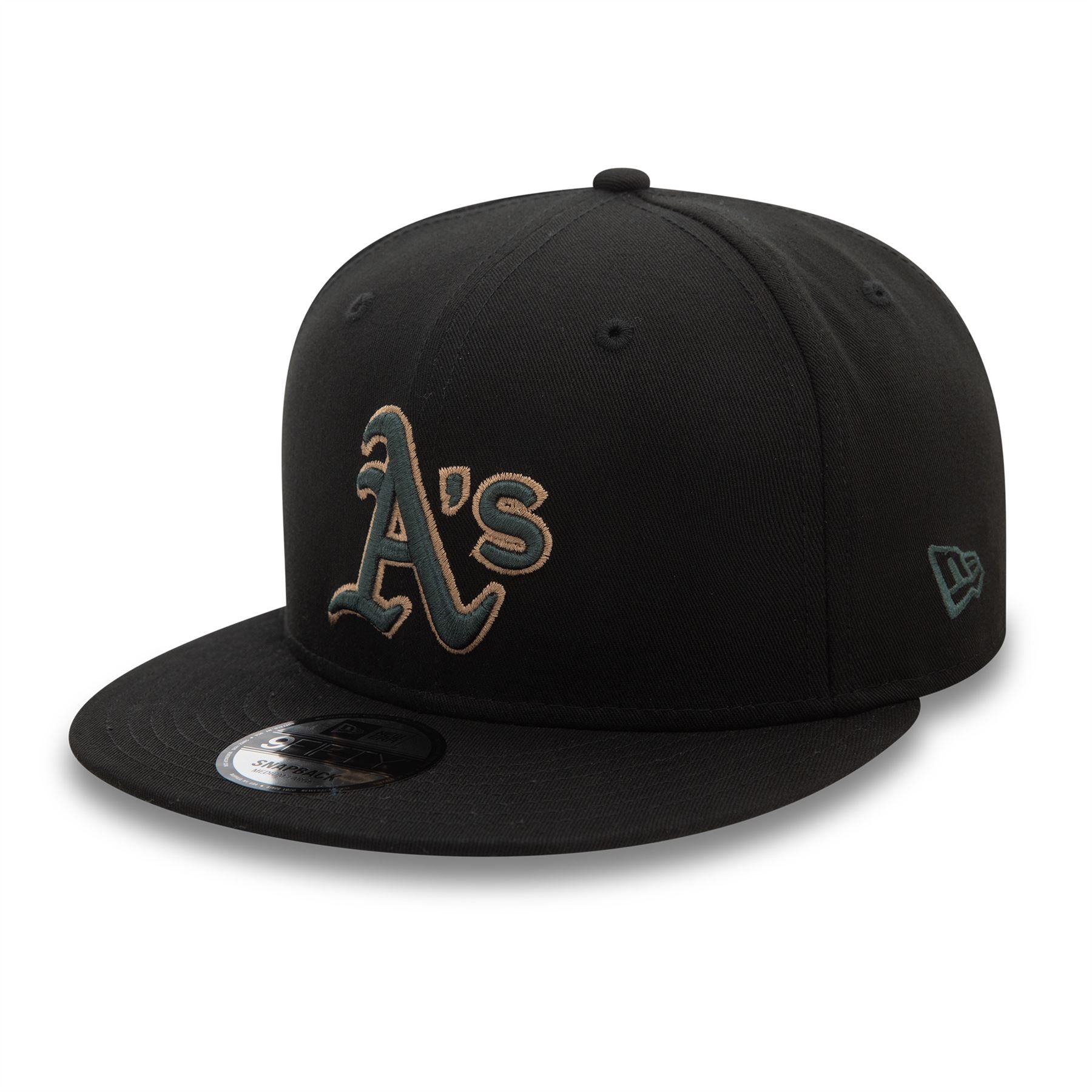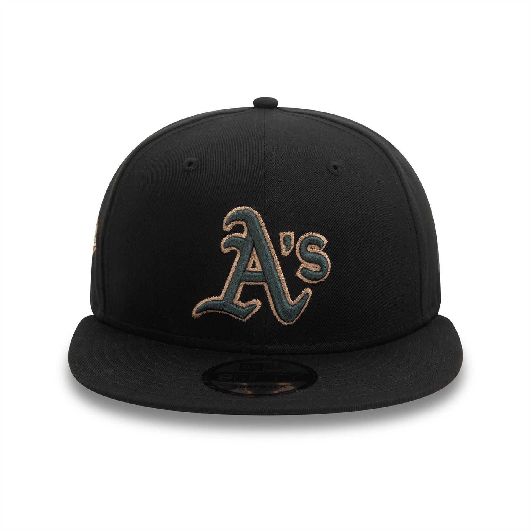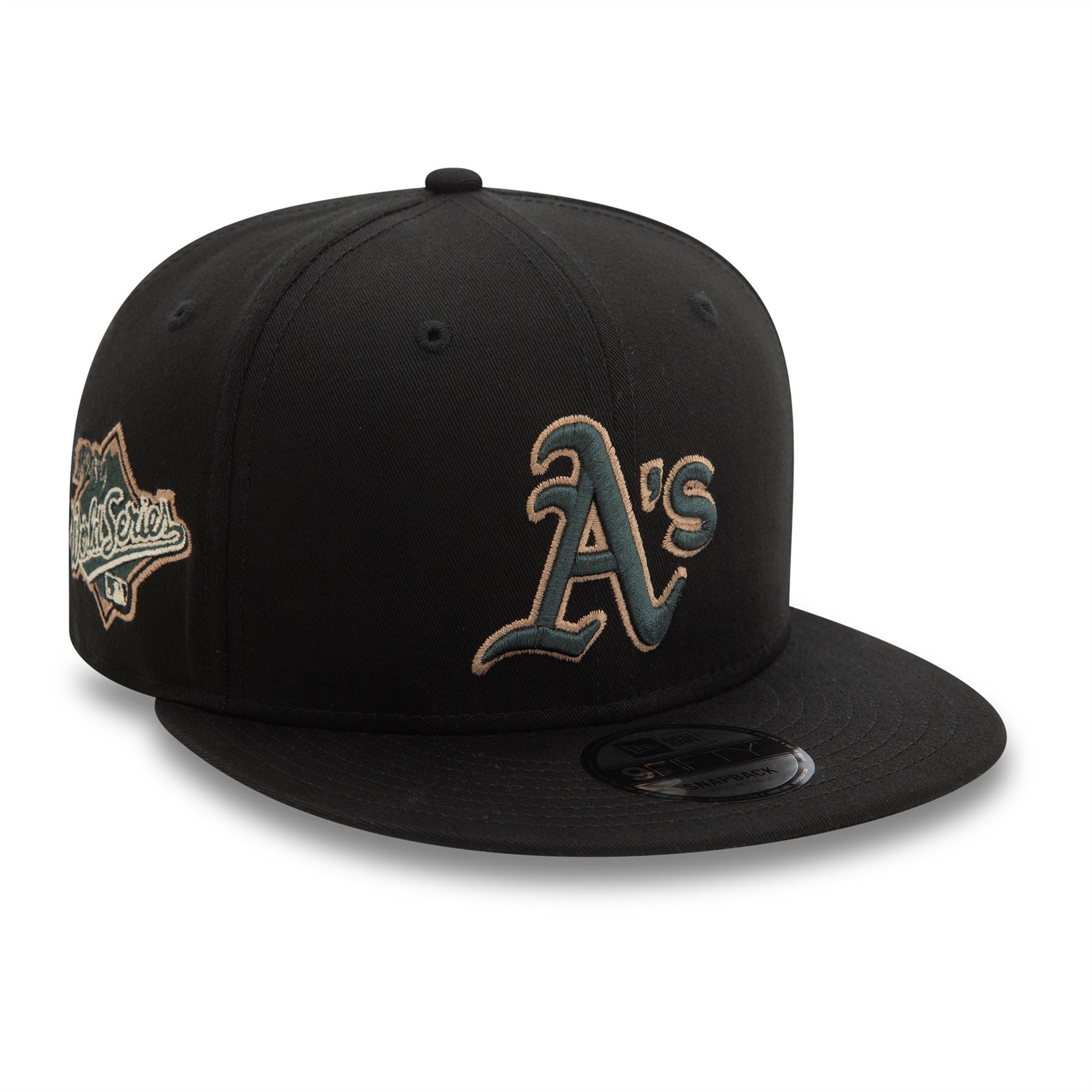 Oakland Athletics Seasonal World Series Black 9FIFTY Snapback Cap. Embroidered Oakland Athletics logo on front. World Series sidepatch on right. Embroidered New Era flag on left. 6 panel structured crown. Flat visor with rear snapback fastener. Black Cap with dark green undervisor.