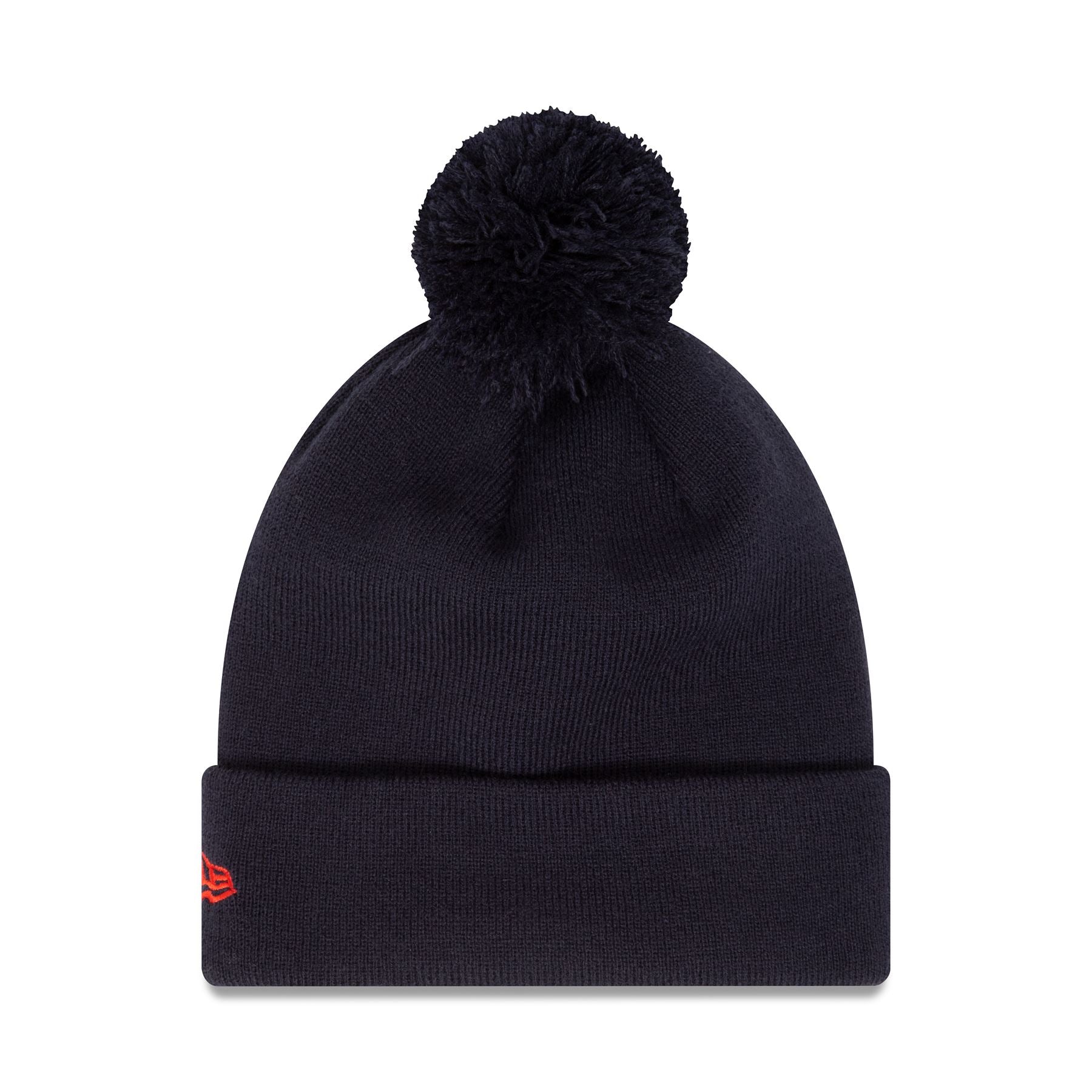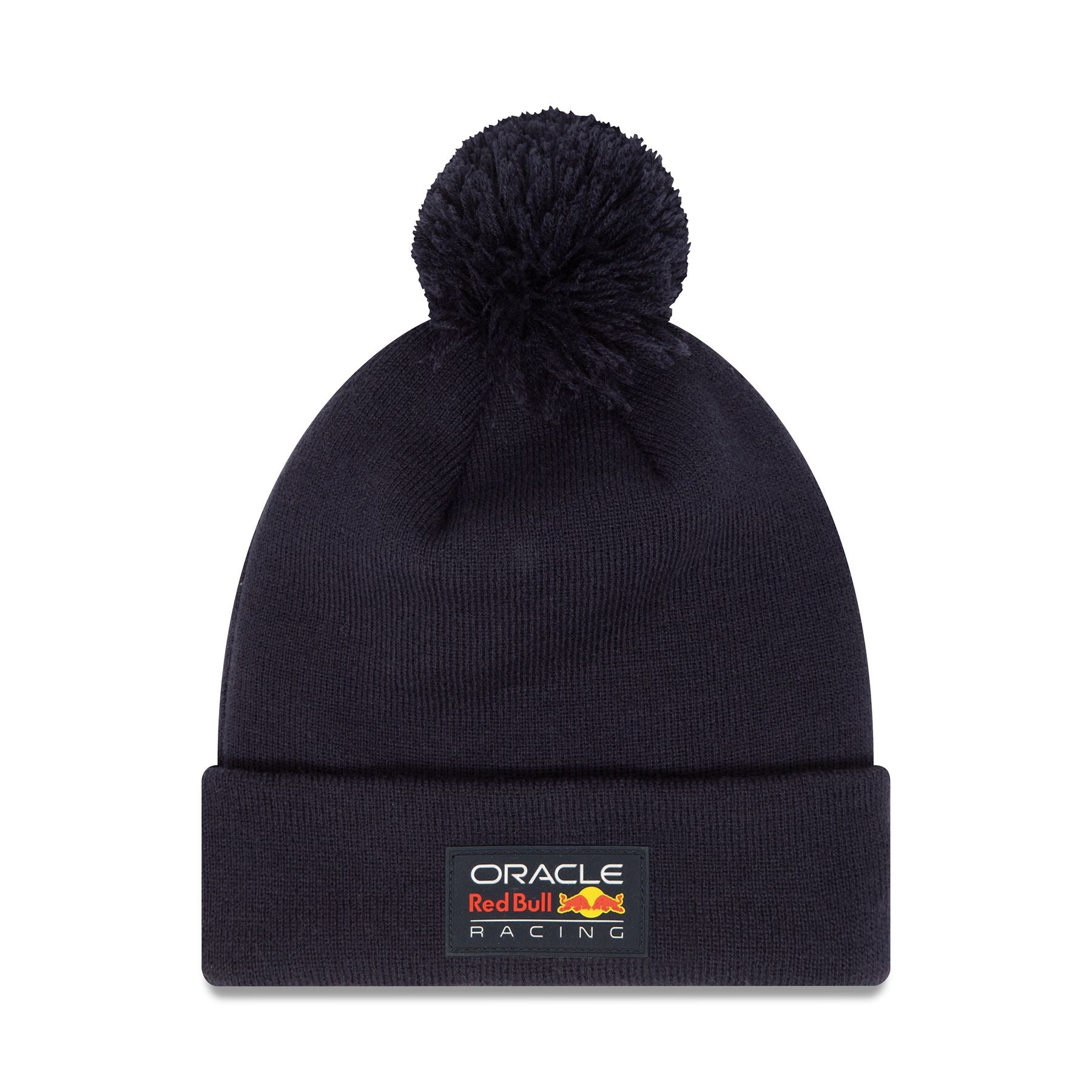 Official New Era Red Bull Essential Bobble Knit Beanie Hat . Oracle Red Bull Racing logo on front. Embroidered New Era flag on left. Knitted crown with upturned cuff. Bobble on top of cuff. Black beanie.