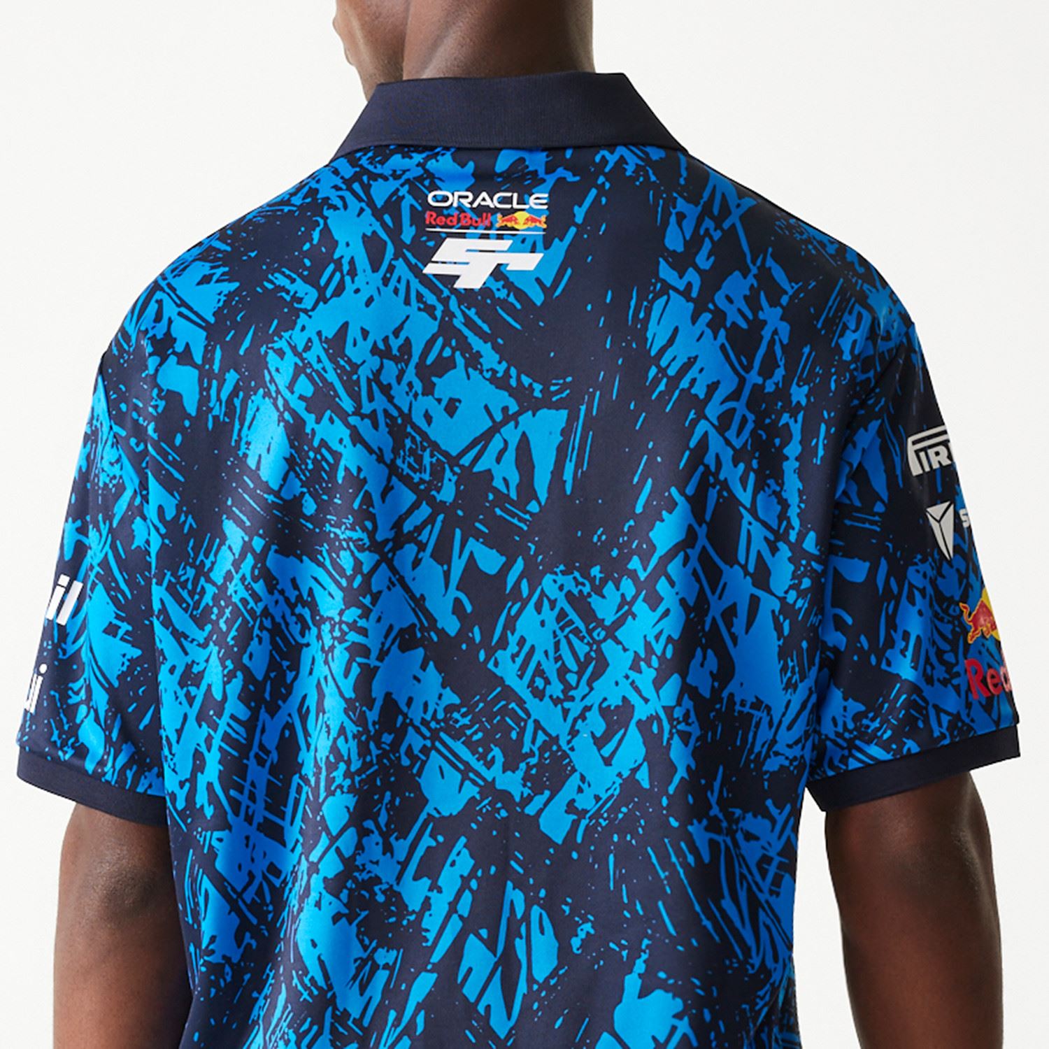 Official Red Bull Racing Sim Collared Jersey New Era Shirt. Red Bull graphic logo on front. Red Bull Sponsers' name logos across chest and along sleeves. Red Bull and Oracle logos on rear. Embroidered New Era logo on front right chest. V neck collared shirt neck. . Colour blue