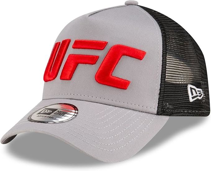 UFC MMA Ultimate Fighting 9FORTY E-Frame Trucker Cap. Embroidered UFC Ultimate Fighting logo on front. Embroidered UFC ring sidepatch on right. Embroidered New Era flag on left. 6 panel structured E-Frame crown. Mesh panels on back and sides. Curved visor with rear snapback fastener. Grey Cap with grey undervisor.